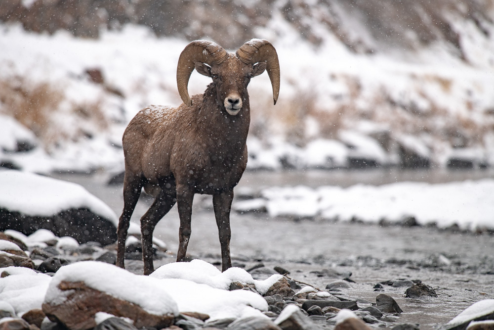 A bighorn ram crossing the river in Waterton Canyon, Colorado